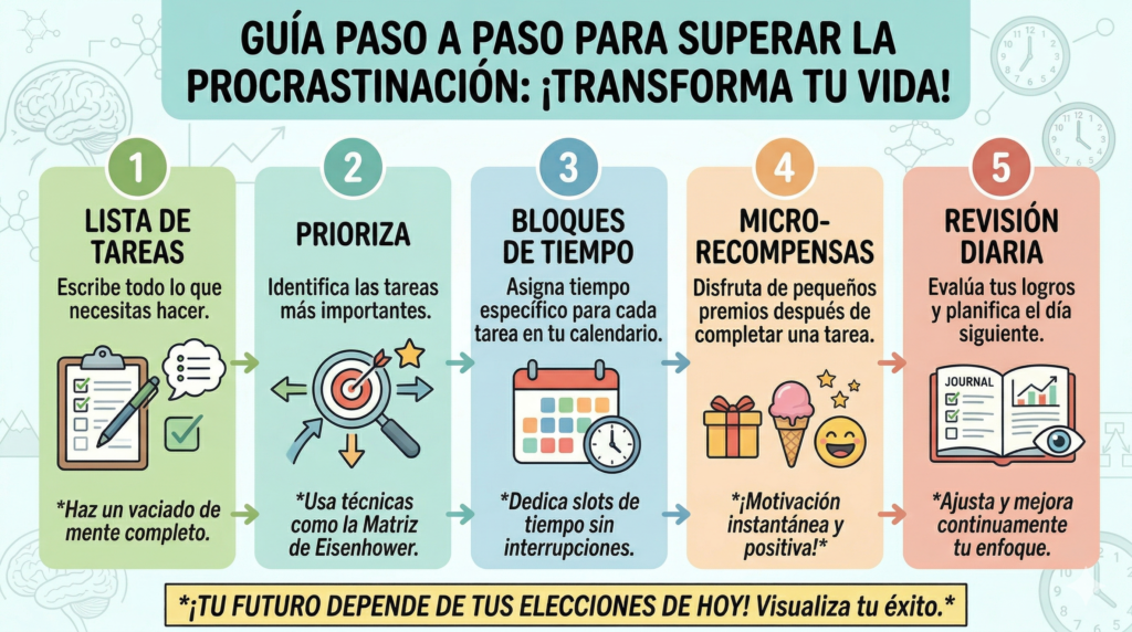 Este enfoque transforma la procrastinación en acción práctica, paso a paso. No necesitas fuerza de voluntad extrema, sino un sistema que aproveche cómo funciona tu cerebro.